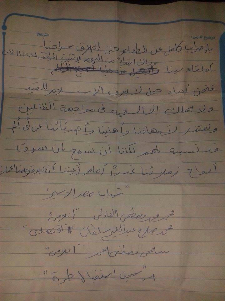 وأضاف المعتقلون : " بعد هذا كله ولأننا أبناء ثورة يناير التي علمت العالم كيف تكون السلمية في مواجهة ظلم وقهر الأنظمة العسكرية الحاكمة ، قررنا أن نواجه بطش هذا الانقلاب بإضراب كامل عن الطعام حتى إطلاق سراحنا أو لقاء ربنا وذلك إبتداء من اليوم الأثنين الموافق 27 يناير 2014 .