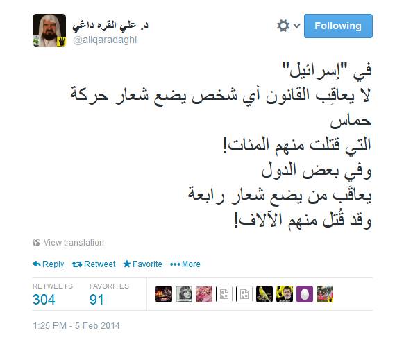قال الدكتور علي القره داغي الأمين العام للاتحاد العالمي لعلماء المسلمين أن الكيان الصهيوني لا يعاقِب أي شخص يضع شعار حركة حماس التي قتلت منهم المئات.