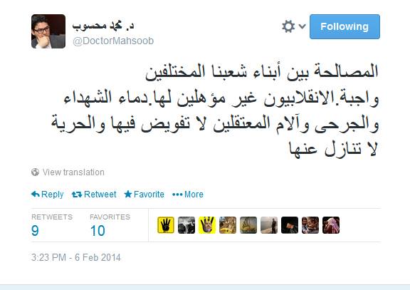 وأضاف محسوب عبر صفحته على موقع التواصل الاجتماعي "تويتر": "دماء الشهداء والجرحى وآلام المعتقلين لا تفويض فيها والحرية لا تنازل عنها".