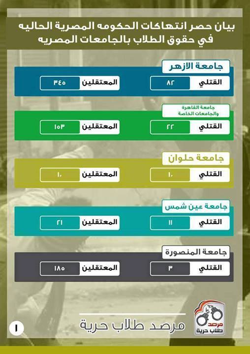 أعلن اليوم أعضاء مبادره مرصد طلاب حريه بيانا قدمو فيه حصر لإنتهاكات حكومة الإنقلاب فى حق طلاب الجامعات المصريه على حد سواء , وقد جاء في البيان أرقام لكل الشهداء والمعتقلين فى جامعات مصر .