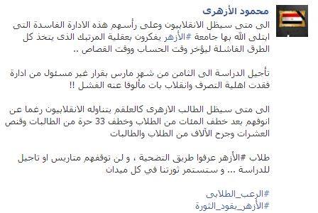 طلاب الأزهر عرفوا طريق التضحية , و لن توقفهم متاريس او تاجيل للدراسة … و ستستمر ثورتنا في كل ميدان .