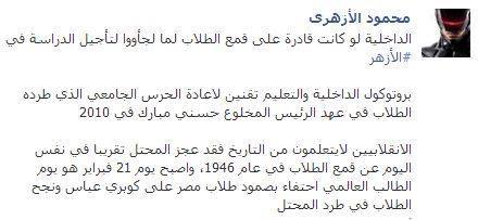الداخلية لو كانت قادرة على قمع الطلاب لما لجأووا لتأجيل الدراسة في الأزهر , وبروتوكول الداخلية والتعليم تقنين لاعادة الحرس الجامعي الذي طرده الطلاب في عهد الرئيس المخلوع حسني مبارك في 2010