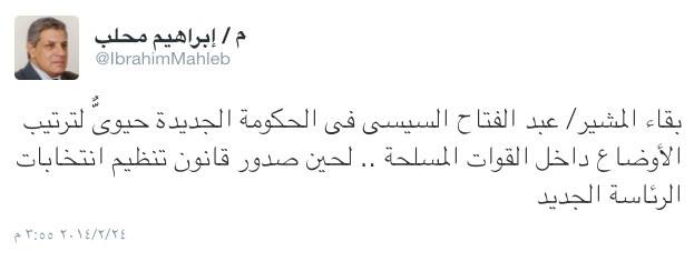 وقد صرح محلب على صفحتة الشخصية بتويتر على نيته في إبقاء عبدالفتاح السيسي فى الحكومة الجديدة كوزير للدفاع , حيث أن وجوده أمر حيوىٌّ لترتيب الأوضاع داخل القوات المسلحة لحين صدور قانون تنظيم انتخابات الرئاسة الجديد .