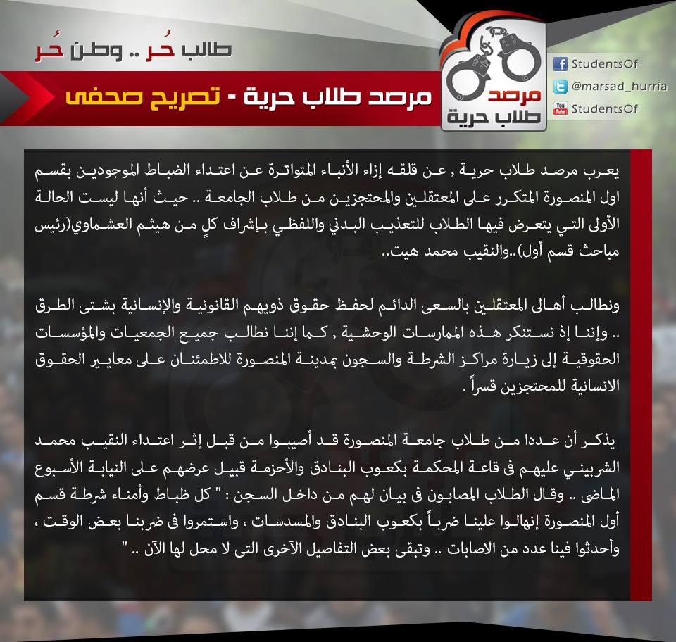 أعرب مرصد طلاب حرية , عن قلقه إزاء الأنباء المتواترة عن إعتداء الضباط الموجودين بقسم اول المنصورة المتكرر على المعتقلين والمحتجزين من طلاب الجامعة ، حيث أنها ليست الحالة الأولى التي يتعرض فيها الطلاب للتعذيب البدني واللفظي بإشراف كلٍ من هيثم العشماوي(رئيس مباحث قسم أول) والنقيب محمد هيت .
