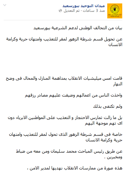 وقال التحالف الوطني لدعم الشرعية ببورسعيد فى بيان عبر صفحته الرسمية "فيس بوك" إن قسم شرطة الزهور تحول لمقر للتعذيب "وامتهان حرية وكرامة الإنسان" من قبل رئيس المباحث و يدعي محمد سليمان و معه عدد من الضباط والمخبرين.