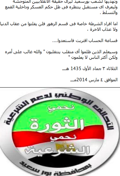 و شدد التحالف أن "ساعة الحساب قد اقتربت وان أفراد قسم شرطة الزهور لن يفلتوا من عقاب الدنيا و عذاب الآخرة".