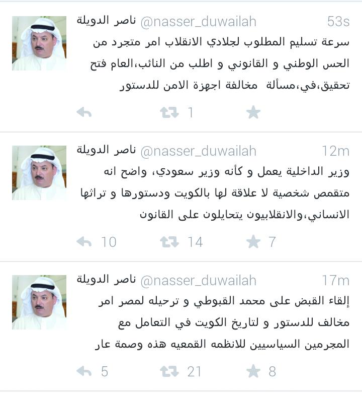 واستطرد قائلا : وزير الداخلية يعمل و كأنه وزير سعودي، واضح انه متقمص شخصية لا علاقة لها بالكويت ودستورها و تراثها الانساني،والانقلابيون يتحايلون على القانون ، يا وزير الداخليه روح نام في بيتك قرير العين بتسليمك بريئ كل ذنبه انه رجل حر يلتزم بالدستور و القانون و الشرعيه انت لا تعرف تراث الكويت ، ولا تملك الثقافه الكويتيه ولا علاقة لك بتاريخ الكويت ومستوى تعاملك مع القضايا المعقده ضعيف ، فانت لا تصلح ابدا في مرحلة دقيقه كالتي تمر فيها الكويت للحفاظ على هويتنا الوطنيه و تراثنا الدستوري و امننا الوطني .