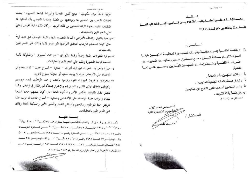 أمرت النيابة العامة بإحالة قضية  طلاب هندسة المنصورة لمحكمة جنايات المنصورة مع استمرار حبس الطلاب المعتقلين, و ضبط وإحضار الطلاب المتغيبين وحبسهم على ذمة القضية.
