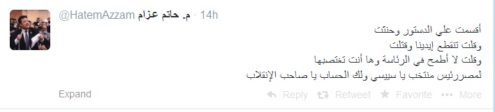 وقال عزام عبر حسابه الشخصى على موقع التواصل الاجتماعي "تويتر" :" أقسمت علي الدستور وحنثت وقلت تنقطع إيدينا وقتلت وقلت لا أطمح في الرئاسة وها أنت تغتصبها .. لمصر رئيس منتخب يا سيسي ولك الحساب يا صاحب الانقلاب".
