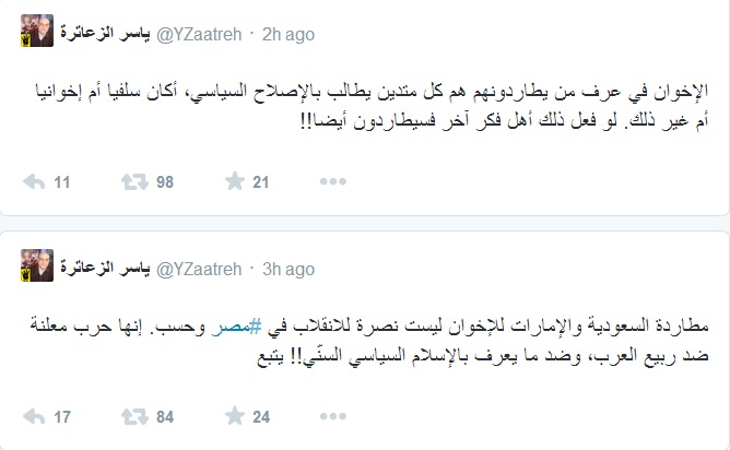 وقال الزعاترة عبر حسابه الشخصى على موقع التواصل الاجتماعي "تويتر" :" مطاردة السعودية والإمارات للإخوان ليست نصرة للانقلاب في مصر وحسب. إنها حرب معلنة ضد ربيع العرب، وضد ما يعرف بالإسلام السياسي السنّي!! "