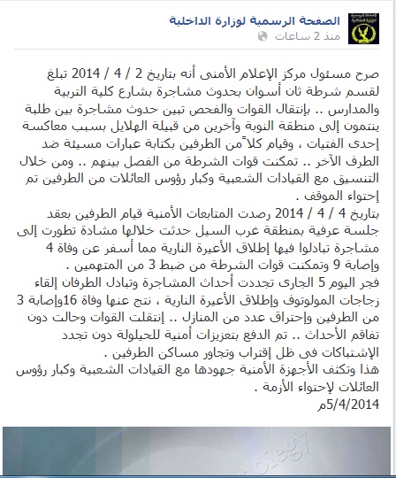 نشرت الصفحة الرسمية لوزارة الداخلية على موقع التواصل الاجتماعي "فيس بوك" : بيانا عن تفاصيل ما حدث فى المشاجرة التى أودت بحياة العشرات بمحافظة أسوان ؛ جاء فيه :"وقعت المشاجرة بين طلبة ينتمون إلى منطقة النوبة وآخرين من قبيلة الهلايل بسبب معاكسة إحدى الفتيات ".