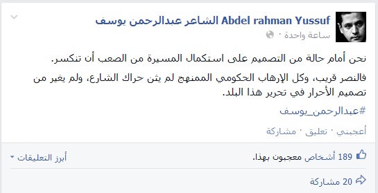 وقال عبر صفحته الشخصية على موقع التواصل الاجتماعى " فيس بوك" :" نحن أمام حالة من التصميم على استكمال المسيرة من الصعب أن تنكسر.