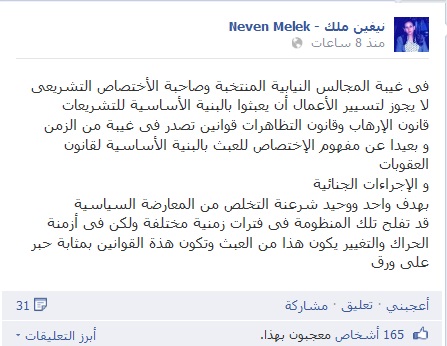 وقالت عبر صفحتها الشخصية على موقع التواصل لااجتماعى "فيس بوك" :" فى غيبة المجالس النيابية المنتخبة وصاحبة الأختصاص التشريعى .. لا يجوز لتسيير الأعمال أن يعبثوا بالبنية الأساسية للتشريعات.