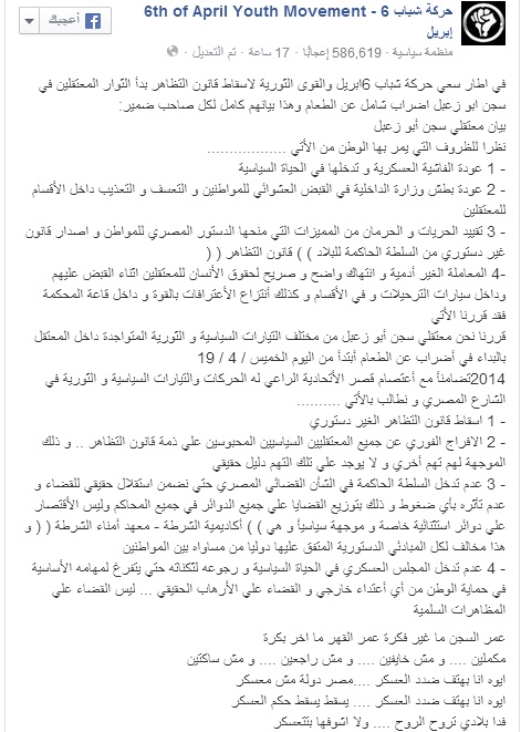أعلنت حركة 6 إبريل أن المحتجزين على خلفية خرق قانون التظاهر من معتقلى الرأى بسجن أبو زعبل وبينهم أعضاء بالحركة دخلوا فى إضراب شامل عن الطعام، مشيرة إلى أن تلك الخطوة تأتى ضمن سعي الحركة والقوى الثورية لإسقاط قانون التظاهر.