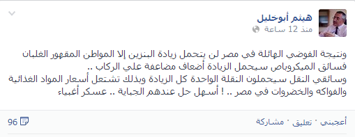 وأضاف أبو خليل في تدوينة على موقع التواصل الاجتماعي " فيس بوك ": ""نتيجة الفوضي الهائلة في مصر لن يتحمل زيادة البنزين إلا المواطن المقهور الغلبان، فسائق الميكروباص سيحمل الزيادة أضعاف مضاعفة علي الركاب، وسائقي النقل سيحملون النقلة الواحدة كل الزيادة وبذلك تشتعل أسعار المواد الغذائية والفواكه والخضروات في مصر".