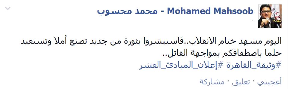 وأضاف محسوب عبر صفحته الرسمية على موقع التواصل الاجتماعي فيس بوك: "اليوم مشهد ختام الانقلاب.. فاستبشروا بثورة من جديد تصنع أملا وتستعيد حلما باصطفافكم بمواجهة القاتل".
