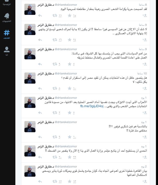 وأضاف الزمر فى تغريدة عبر صفحته على موقع "تويتر": "ﻻ شك أن اﻻعﻻن عن فوز السيسى فوزا ساحقا !! لن يكون إﻻ بداية لحراك شعبى أوسع لن ينتهى إﻻ بنهاية اﻻنقﻻب العسكرى."