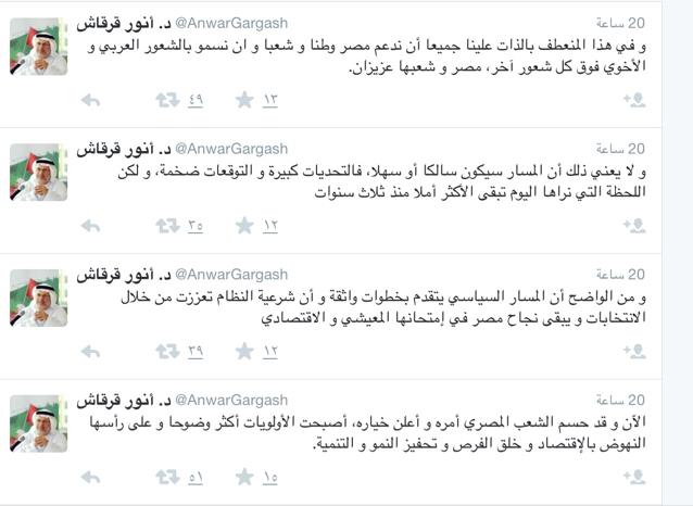 وقال أنور قرقاش وزير الدولة للشؤون الخارجية في الإمارات في تغريدة له على موقع التواصل الاجتماعي "تويتر": "في هذا المنعطف بالذات علينا جميعا أن ندعم مصر وطنا وشعبا، وأن نسمو بالشعور العربي والأخوي فوق كل شعور آخر.. مصر وشعبها عزيزان".