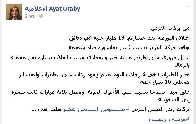 وأضافت عرابى فى تدوينة عبر صفحتها على "فيس بوك": من بركات العر*، إغلاق البورصة بعد خسارتها 19 مليار جنيه في دقائق، توقف حركة المرور بسبب كسر بماسورة مياه بالتجمع، شلل مروري على طريق مدينة نصر والمعادي بسبب انقلاب سيارة نقل محملة بالرمال".