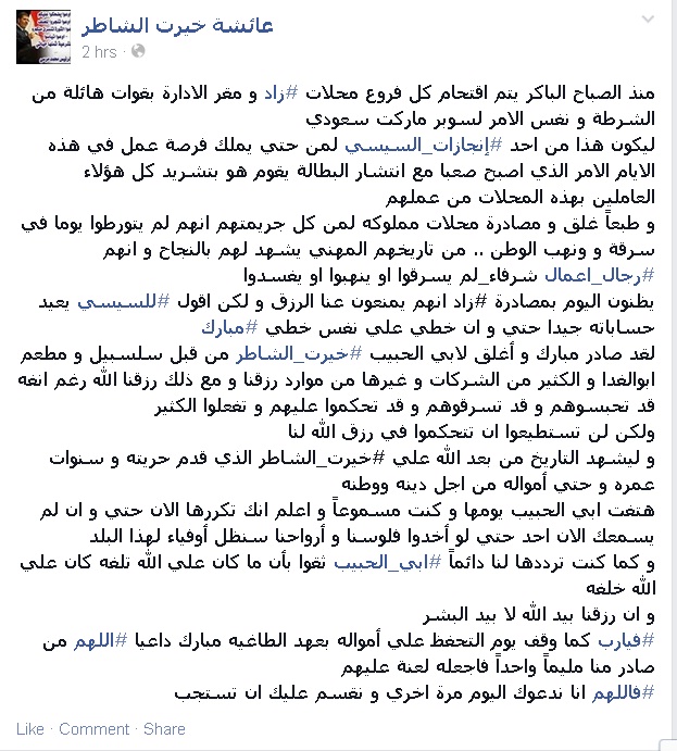 وأضافت عائشة فى تدوينة عبر صفحتها على "فيس بوك": "منذ الصباح الباكر يتم اقتحام كل فروع محلات زاد و مقر الإدارة بقوات هائلة من الشرطة و نفس الأمر لسوبر ماركت سعودي ،ليكون هذا من أحد إنجازات السيسي لمن حتي يملك فرصة عمل في هذه الأيام الأمر الذي أصبح صعبًا مع انتشار البطالة يقوم هو بتشريد كل هؤلاء العاملين بهذه المحلات من عملهم".