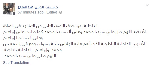 وأضاف عبد الفتاح فى تدوينة عبر صفحته على "فيس بوك": "الداخلية تقرر حذف النصف الثانى من التشهد فى الصلاة لأن فيه اللهم صل على سيدنا محمد وعلى آل سيدنا محمد كما صليت على إبراهيم وعلى آل سيدنا إبراهيم، لأن وزير الداخلية البلطجية الذى أنعم عليه الهلالى برتبة رسول يجمع فى اسمه بين محمد..وإبراهيم. .الداخلية بلطجية.