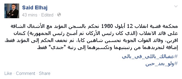 وقال الحاج فى تدوينة عبر "فيس بوك": "محكمة قضية انقلاب 12 أيلول 1980 تحكم بالسجن المؤبد مع الأشغال الشاقة على قائد الانقلاب (الذي كان رئيس الأركان ثم أصبح رئيس الجمهورية) كنعان افرين، وقائد القوات الجوية تحسين شاهين كايا، ثم تخفف الحكم إلى المؤبد فقط، إضافة لتجريدهما من رتبتيهما وتكسيرهما إلى رتبة "جندي" فقط".